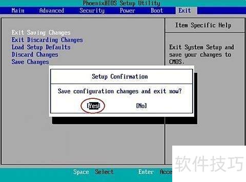 4、 最后将光标移至Exit选项,选择其中的Exit Save Changes并按下回车键,在弹出的确认窗口中选择YES,再次回车确认,系统将自动重启并从光驱启动,进入后续安装或操作流程。