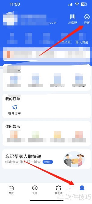 1、 打开菜鸟应用,进入个人页面,点击右上角设置按钮。