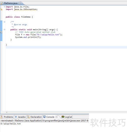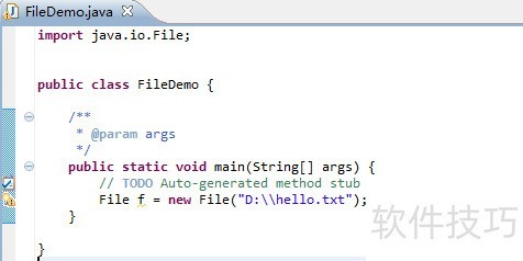 2、 所示,创建文件对象:File f = new File(D:\hello.txt); 指向D盘根目录下的hello.txt文件。