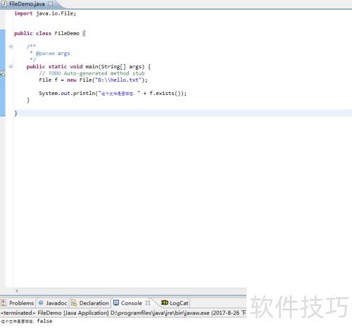 6、 输出提示:该文件是否存在,结果为 f.exists() 的返回值。