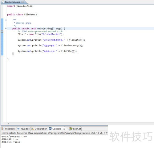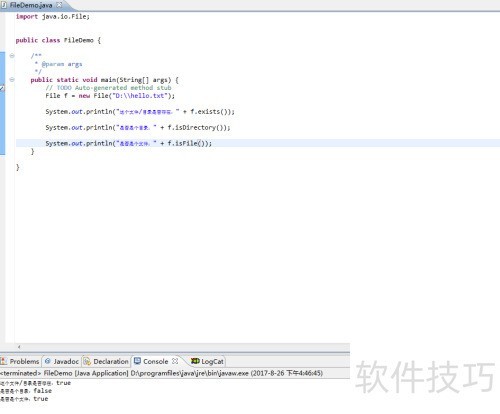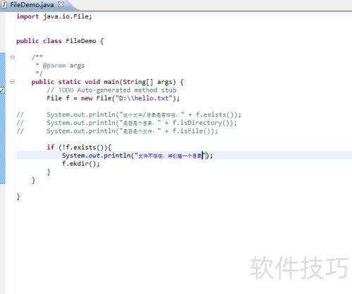 3、 仅用一行代码便完成了File类的实例化,此时变量f指向D盘下的hello.txt。需要注意的是,尽管名称为hello.txt,但它不一定是一个文件,也可能是一个同名目录,名称本身并不决定其实际类型。
