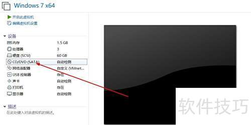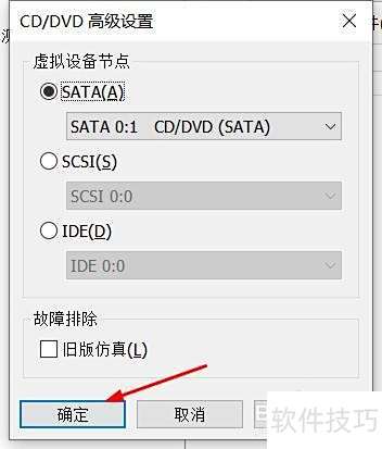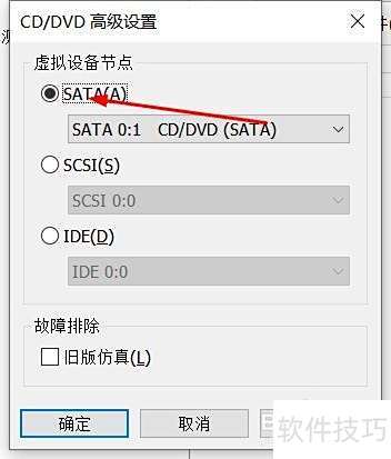 在虚拟机设置中配置CD/DVD为虚拟SATA设备,并选定对应节点。