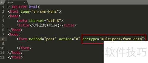 4、 在表单标签中加入 enctype 属性,具体设置如示例图所示。