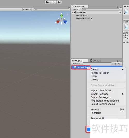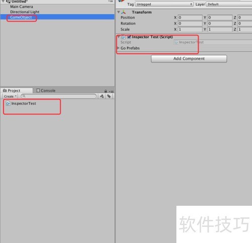 5、 脚本编译无误后,返回Unity界面,在场景中创建新的GameObject,并将脚本组件拖放到该对象上,操作所示。
