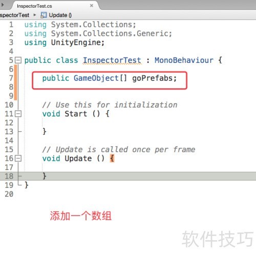 4、 在脚本中添加一个公开的GameObject数组,具体代码及说明见下图。