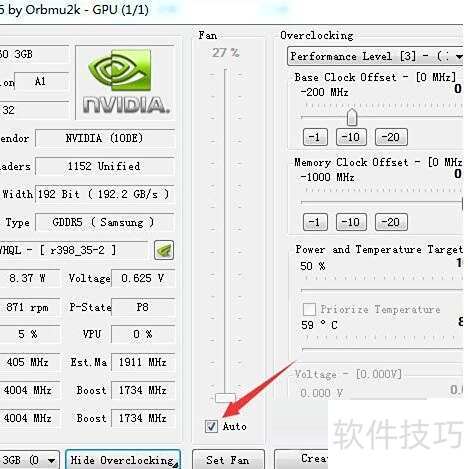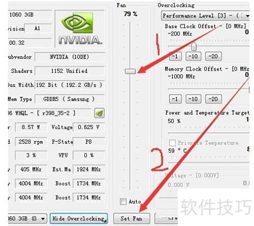4、 取消勾选√后,鼠标即可点击箭头1指向的按钮,通过上下拖动调节显卡风扇转速。将滑块调整至目标位置后,点击箭头2标注的Set Fan按钮,即可确认并应用设定的风扇速度,完成调节操作。