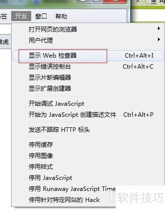 5、 在工具栏中选择开发菜单,点击显示Web检查器。