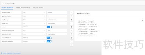 7、 在inspect界面中,手动设置测试应用及相关系统参数(例如Android 8),这些信息需与脚本中所写保持一致,可参照下图进行填写。