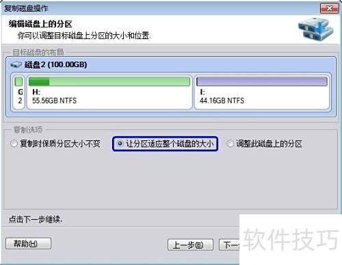 5、 进入编辑磁盘上的分区界面后,提供三种复制选项:一是保持原分区大小不变;二是将分区扩展至占据整个磁盘空间;三是手动调整当前磁盘的分区布局。不同选择将直接影响分区结果,用户可根据实际需求进行设置,合理分配磁盘空间以满足后续使用要求。