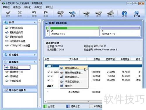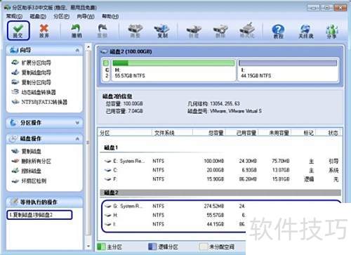 13、 主界面显示磁盘1的所有分区已成功复制到磁盘2,务必点击工具栏中的按钮,以免操作无效。完成此步骤后,磁盘的复制与克隆工作即全部结束,目标磁盘已完整获得源磁盘的数据内容。
