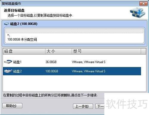4、 在选择目标磁盘对话框中,选择磁盘2作为目标磁盘即可完成操作。