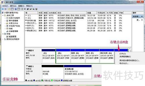 4、 右键H盘,从菜单中选择删除卷(D)选项。