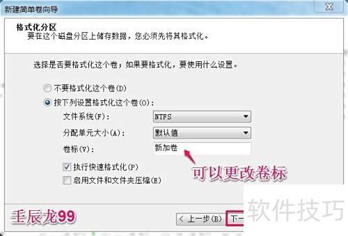 14、 在分区格式化界面,可修改卷标名称,例如设为电影电视等,设置完成后点击下一步继续操作。
