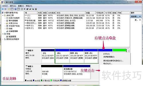 2、 右键点击桌面上的计算机图标,选择管理选项,进入计算机管理界面后,点击左侧的磁盘管理即可。
