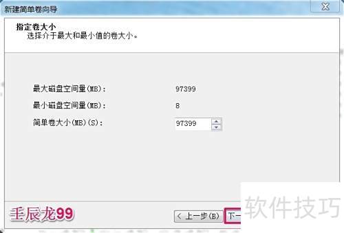12、 在指定卷大小界面,保持默认设置,点击下一步按钮。