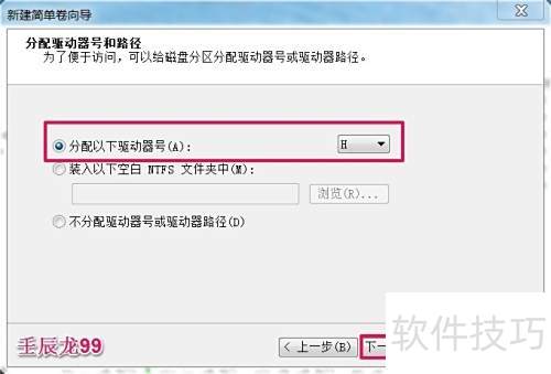 13、 在分配驱动器号和路径界面中,保持默认驱动器号H(可修改),然后点击下一步。