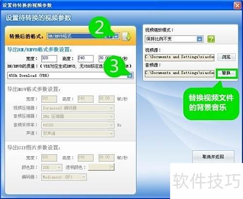5、 所示,软件已将RMVB格式的质量参数默认设置为广泛使用的450K下载标准,直接使用该默认设置即可输出画质出色的RMVB视频。此外,这里分享一个实用小技巧:只需点击右侧替换按钮,便可轻松将原视频的音频替换为自己喜爱的背景音乐,操作简便,极大提升了视频编辑的个性化体验,满足多样化创作需求。