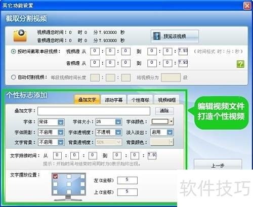 7、 进入其它功能设置界面后,可对视频进行裁剪和基础编辑。系统支持添加多种个性化元素,如文字叠加、滚动字幕、专属商标及视频相框等。中绿色框区域所示,选择所需样式进行添加即可完成编辑。若无需添加任何元素,直接点击确认按钮跳过该步骤,继续后续操作。