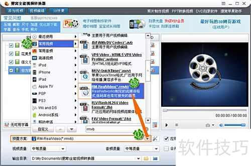 3、 选择合适的输出格式,软件支持多种格式供用户按需选用。本次需将视频转换为rmvb格式,操作方法为:点击预设方案右侧的下拉箭头,展开菜单后依次选择常见视频中的RM-RealVideo(*.rmvb)。该格式由RealNetworks开发,属于流媒体类型,即使在较低码率下仍能保持较为理想的画面质量,适合对存储空间和传输效率有要求的用户使用。