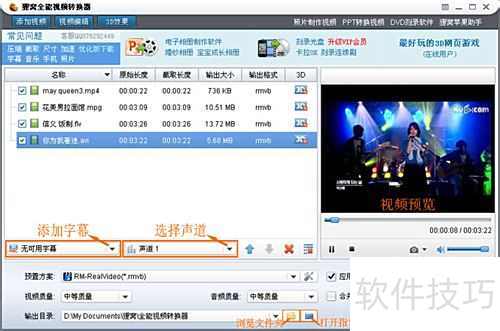 4、 软件具备多种实用功能,可导入视频字幕、选择音轨声道、自定义输出路径等。主界面右侧设有预览窗口,支持播放所选视频文件,兼具视频播放器功能,操作便捷,提升用户使用体验。