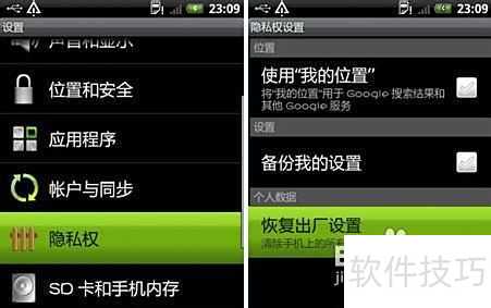 4、 在开机状态下,进入设置,选择隐私权,点击恢复出厂设置,再选择重置手机并清除所有内容。手机将自动重启并进入recovery模式,此操作不会删除任何数据,仅用于进入recovery界面,请放心操作。