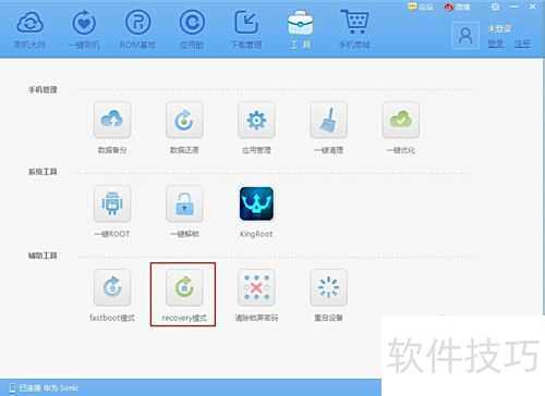 4、 安装完手机驱动后,进入工具选项,选择进入Recovery模式并点击。