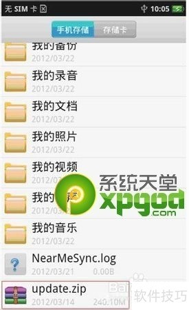 5、 选择update.zip文件,按下电源键进行确认操作。