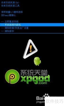 4、 使用音量键调整选项,选定手动选择升级包后,按电源键确认进入。