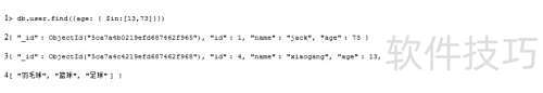 1、 查询年龄为13或73的数据,类似于数据库中的IN操作,仅返回满足这两个值之一的记录信息。