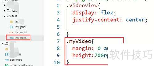 6、 打开test目录中的test.wxss文件,找到类名为myVideo的样式,将其高度属性height设置为700rpx,具体样式调整所示。