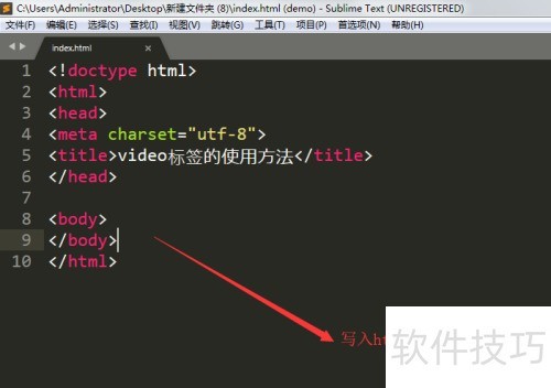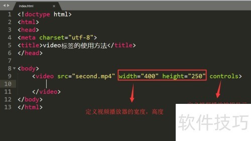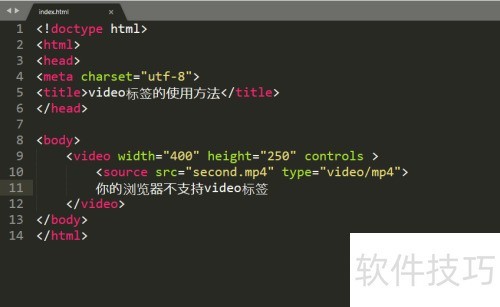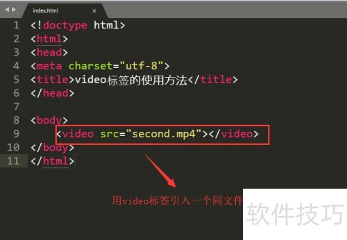3、 在 body 标签内添加 video 标签,用于嵌入视频文件。