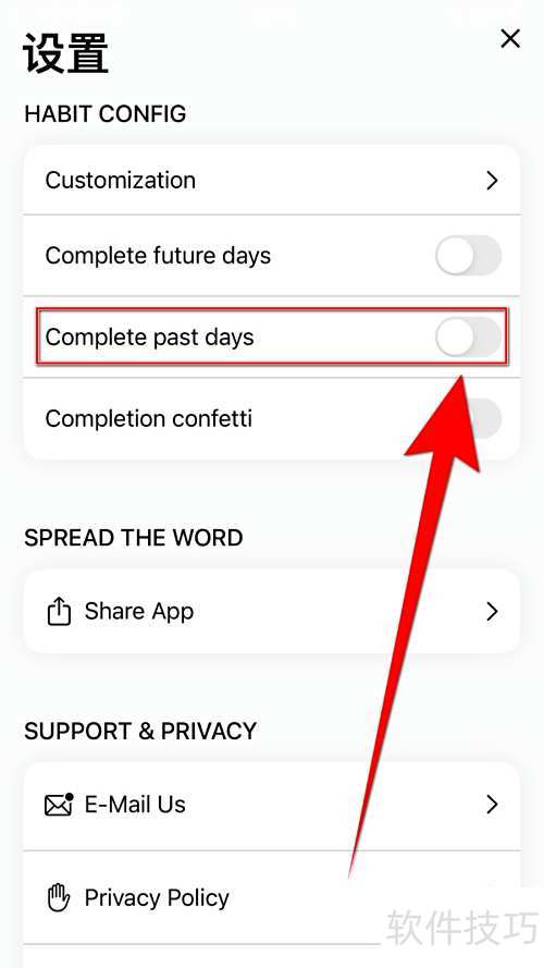 2、 在设置页面中,点击Complete past days选项后的圆形按钮。