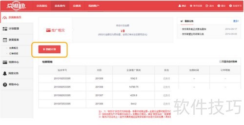 13、 京挑客费用结算中心统一汇总各推广计划的消耗金额。