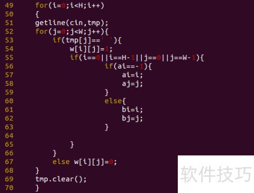 2、 变量w用于标记位置i行j列是否为障碍,0表示障碍,1表示可通过的通道。