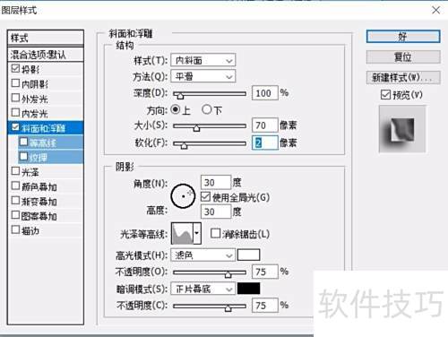6、 将所有图层合并后,调整图层样式的浮雕参数,预览文字效果,待效果达到最佳时确认操作,即可完成美食POP的浮雕制作。