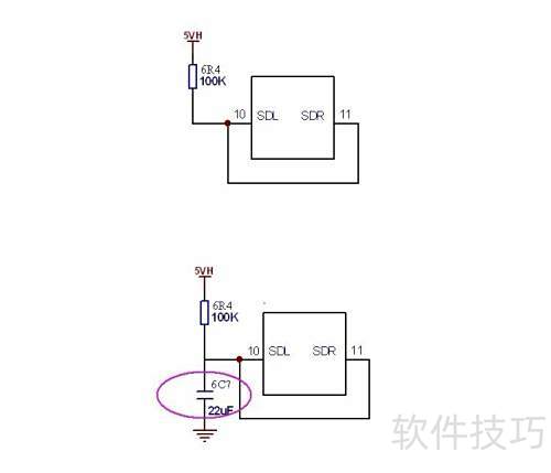 5、 当SDL和SDR为低电平时,电路处于关闭状态,此时系统不会输出音频信号。若在上电瞬间使该控制脚保持低电平,便可有效避免POP声的出现。原设计中,上电时关断引脚为高电平,导致功放立即启动,容易产生爆破声。为解决此问题,在关断脚与地之间接入一个约22μF的电容。上电初期,该引脚因电容尚未充电而维持低电平,电路保持关闭;随着电容逐渐充电,电压缓慢上升,直至达到高电平后,D类功放芯片才开始正常工作。通过这一延迟过程,避开了上电瞬间的电流冲击,从而消除POP声。电容容量可根据实际需求适当调整,以优化延迟时间与启动特性。