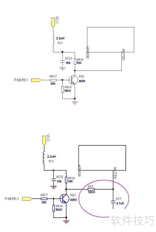 7、 电路初始状态下,MUTE引脚上电时为低电平,此时静音功能不启用,D类音频功放IC可正常启动工作。为优化上电过程中的噪声问题,可在MUTE控制端串联一个电阻6R14,并在MUTE端与VCC之间并联一个约4.7μF的电容。上电瞬间,电容开始充电,使MUTE脚电位先处于高电平,实现静音状态;随后通过6R14缓慢放电,MUTE端电压逐渐下降,最终变为低电平,功放解除静音。该延时过程可有效避开上电时产生的POP声。其中,所加电容6C23的容值可根据实际需求调整,容值越大,MUTE信号与VCC之间的时序延迟越长,静音解除越晚,抑制冲击噪声的效果越明显。