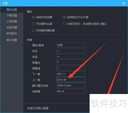 4、 在设置窗口的播放设置区域,将上一集快捷键更改为,点击即可生效。