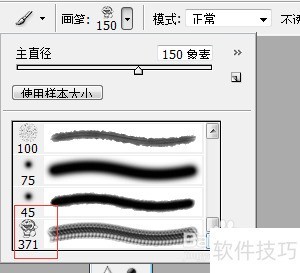 9、 选用画笔工具,点击左上属性栏,选取先前自定义的笔刷。
