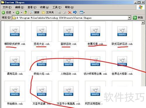5、 可将.csh文件放入安装目录的/Presets/Custom Shapes/文件夹内,便于查找时可使用中文命名。