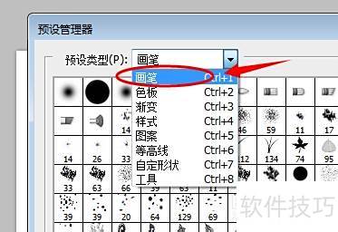 4、 开始加载笔刷,进入编辑菜单选择预设管理器,于新窗口中选中画笔类别,再点击右侧的载入按钮完成操作。