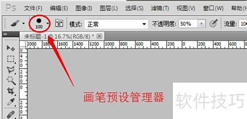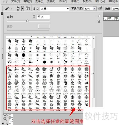 6、 现在可以使用新导入的笔刷。选择左侧工具栏中的画笔工具,鼠标将显示为小圆圈,接着点击上方的画笔预设管理器,双击任一图案即可应用。