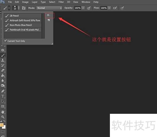 4、 在画笔对话框中,画笔图标右侧有一个倒置的黑色三角形,点击该三角形,所示。