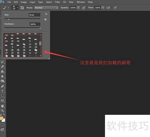 9、 加载完成后,画笔即被导入。重新打开画笔工具箱,便可看到已添加的画笔样式,具体效果所示。