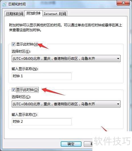 6、 若要显示三个时钟,只需勾选两个显示此时钟复选框,然后点击应用即可完成设置。