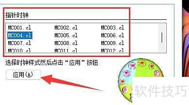 4、 在弹出窗口中选择所需时钟样式,例如MC004.cl,然后点击应用按钮确认设置。
