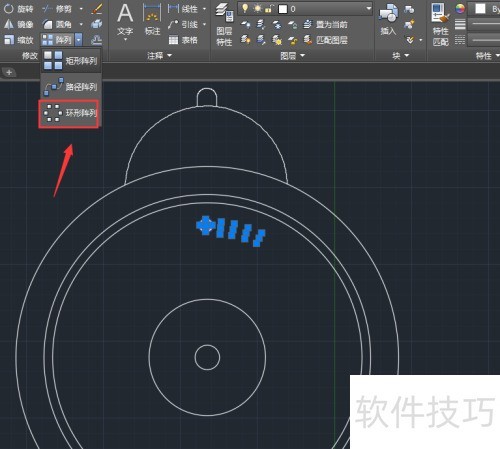 6、 选中已绘制的刻度线,进入修改菜单,选择环形阵列功能,操作所示。
