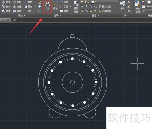 7、 选定圆形阵列后,指定圆心为阵列中心,输入数量12,按回车键即可完成表盘绘制,效果所示。