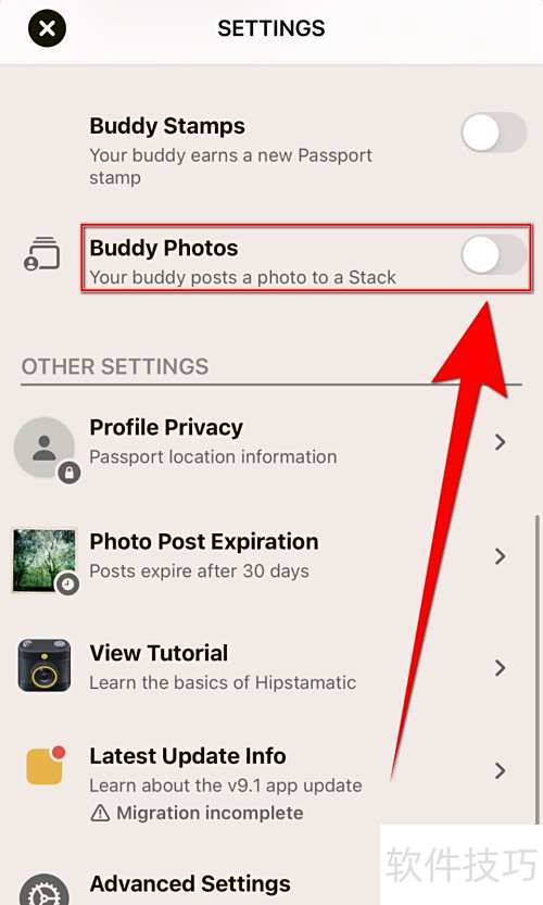 4、 当后面的圆点变成灰色时,说明Hipstamatic已成功关闭该功能。