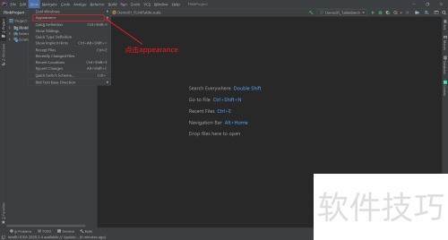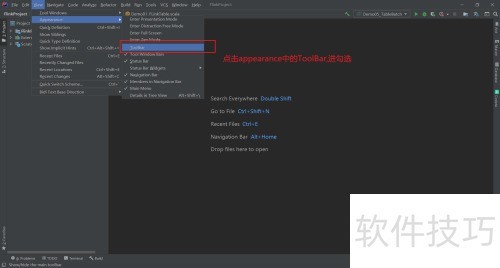 在IDEA中默认隐藏工具栏,可通过View菜单中的Appearance选项,勾选Tool Window Bar来显示工具栏。